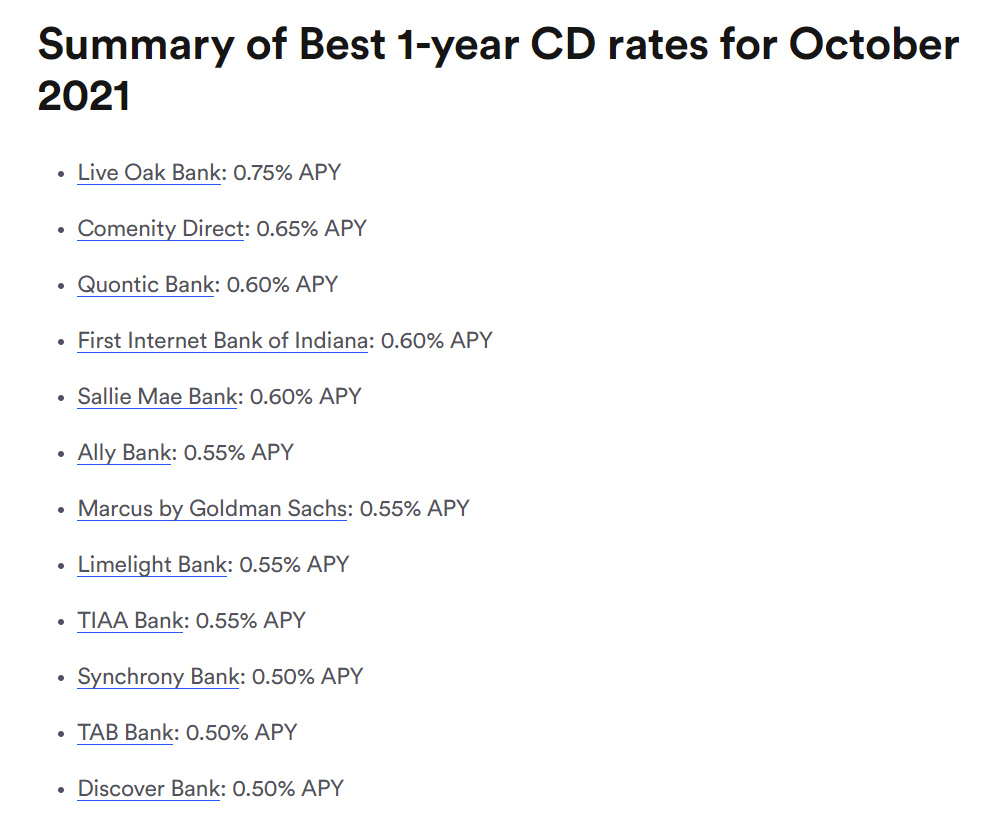 投资理财的目的是保值和增值。每个人风险承受能力和回报期待不一样,因此会选择不同的理财方式。存钱是最基本也是最简单的理财方式。随存随取是活期,固定存一段时间就是定期,因为时长和灵活度不一样,利息也不一样。2021年,中国活期存款利率在0.3%左右,不同冻结期的定期可能会有1%到4%不等的利息。美国这边活期存款是没有利率的。即使是定期,这边称为CD(certificate of deposit) 大额存单,利率一般也就在0.5% – 1%之间。下图是10月份美国不同银行一年定期的年利率。