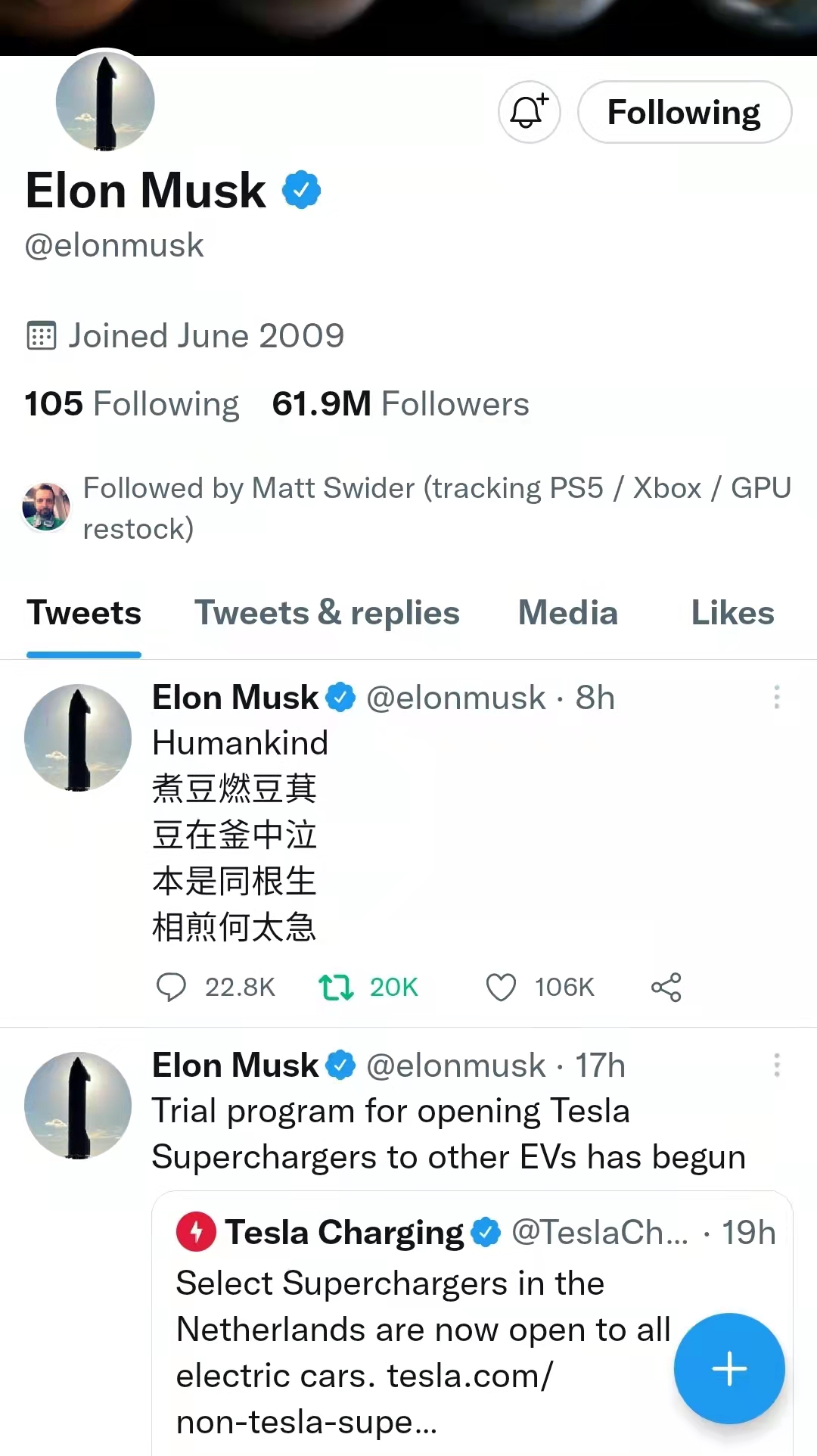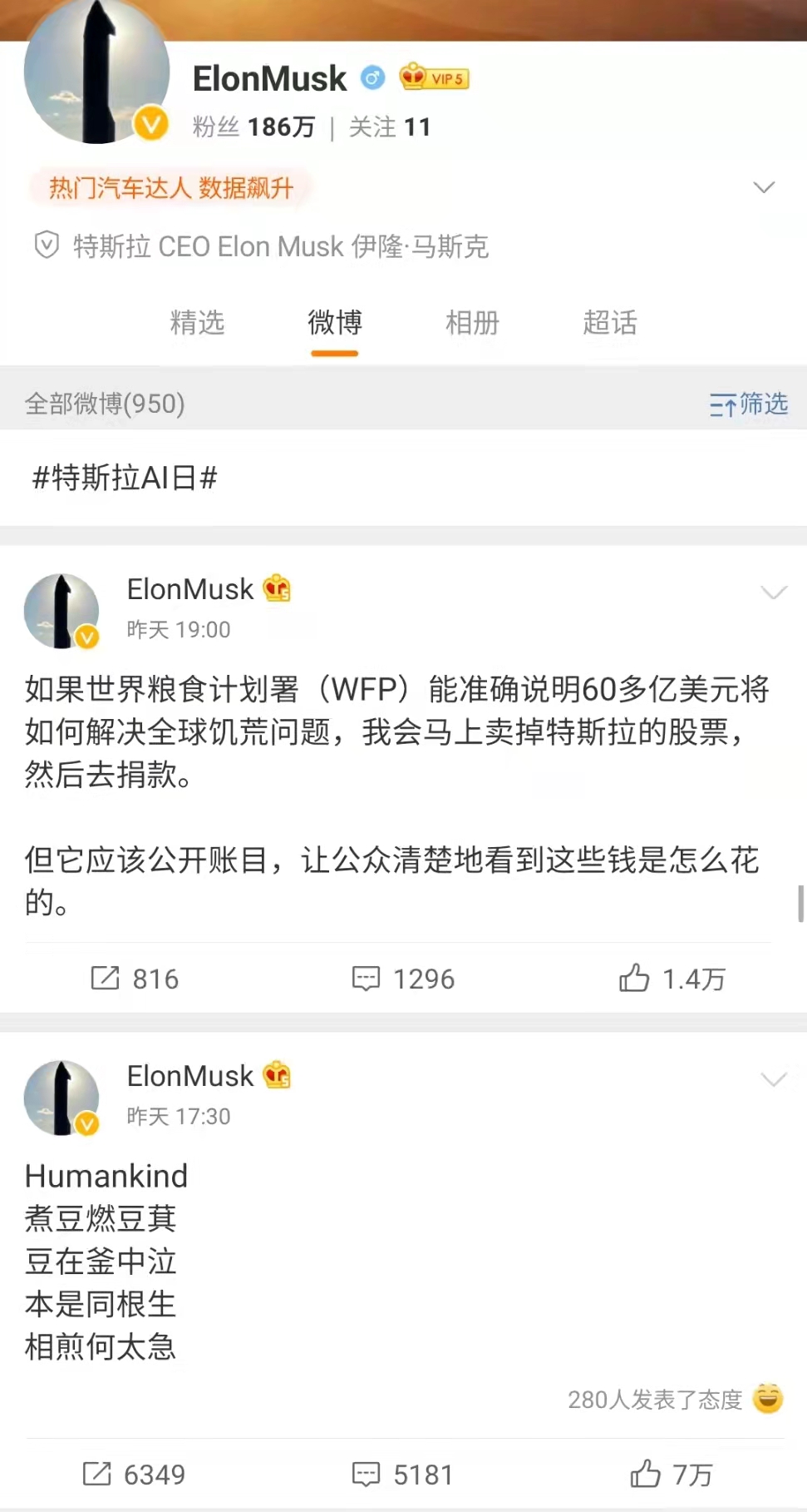 今天马斯克在他的新浪微博账号引用了曹植的《七步诗》,并在前面加了个Humankind。他的推特也同步更新了。微博全网都在猜测他的用意。有的猜他是被世界粮食计划署(WFP) 逼捐,所以以诗回应;有的猜是因为美国民主党欲草拟亿万富豪所得税,因此马斯克有感而发。不管他想表达什么,我想要译一下这首诗。